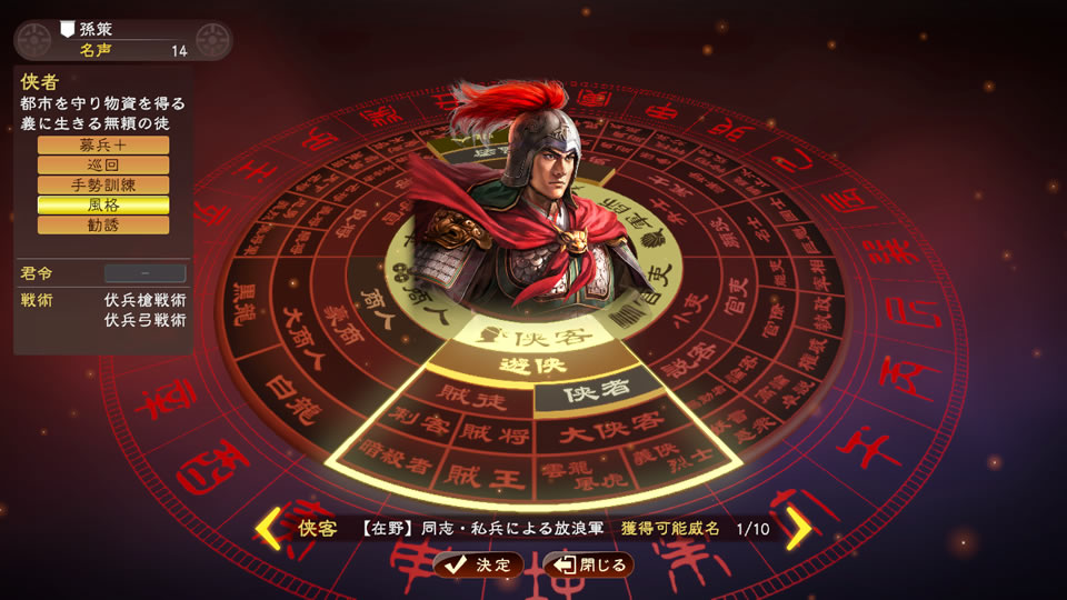 威名には複数の系統があります。たとえば、私兵を編制して大陸全土に武名をとどろかせる侠客や、蓄えた私財を投じて好みの勢力に肩入れできる商人などは、在野でのプレイスタイルを大きく強化してくれます。また、人心の操作や城塞の乗っ取りに長けた軍師や、軍勢の運用に能力を発揮する将軍などは、仕官先の勢力でより多彩な活躍ができます。
