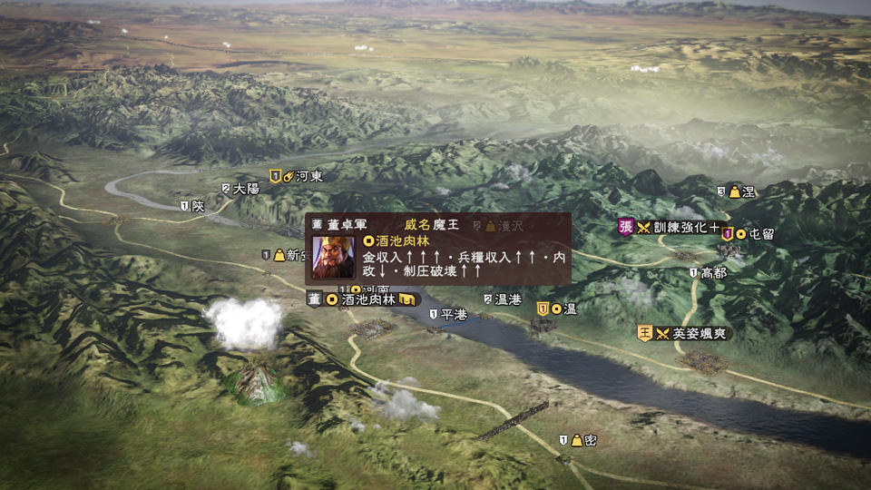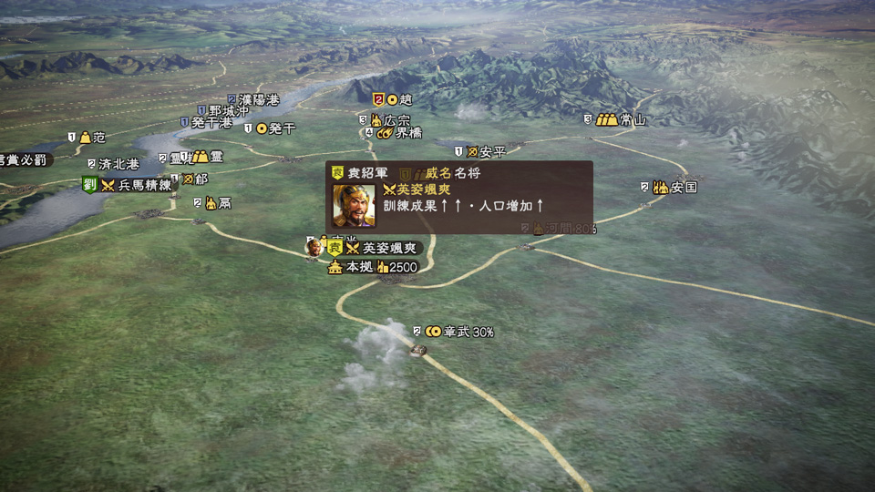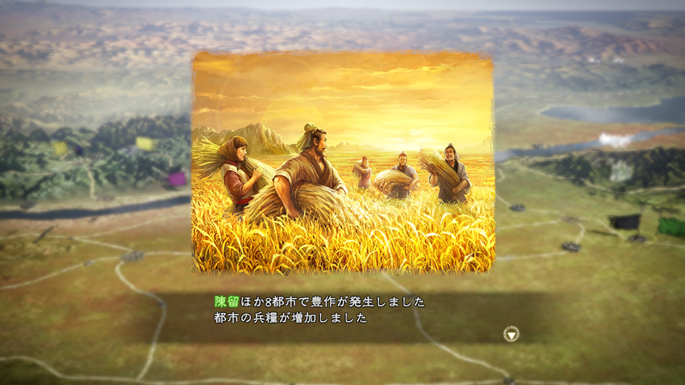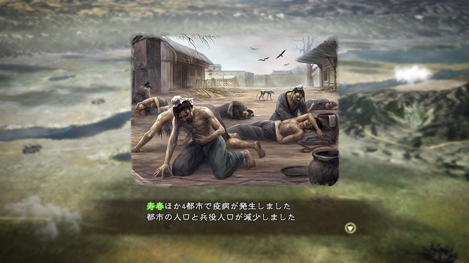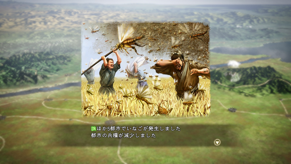 新要素として、毎季節ランダムに発生する災害が追加されます。疫病、洪水、いなご、豊作の4種類が発生し、都市の人口を減少させたり、兵糧の相場を高騰させたりとさまざまな面に影響を与えます。