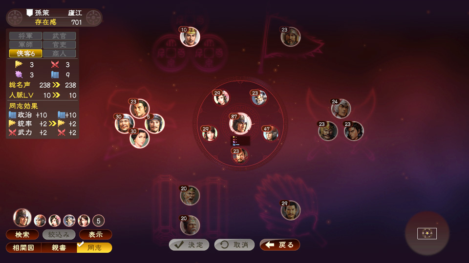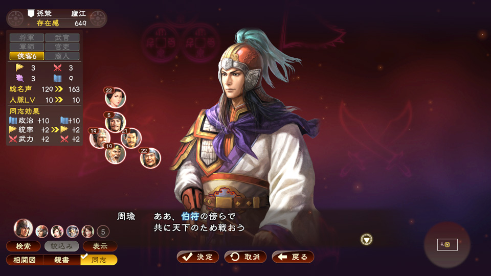 同志がいる状態で旗揚げを行うと、同志たちも新勢力に加わります。また、同志との間で、自身の威名に応じたイベントも発生します。