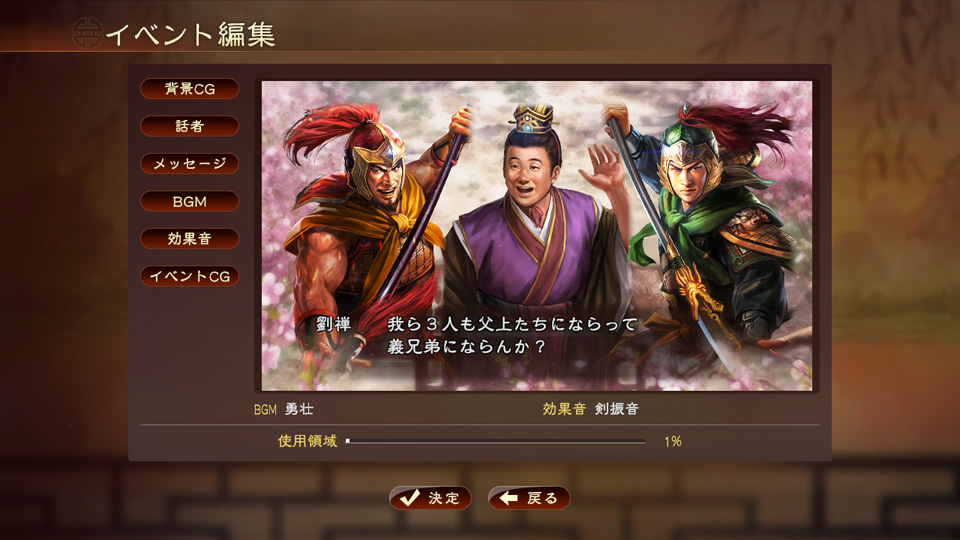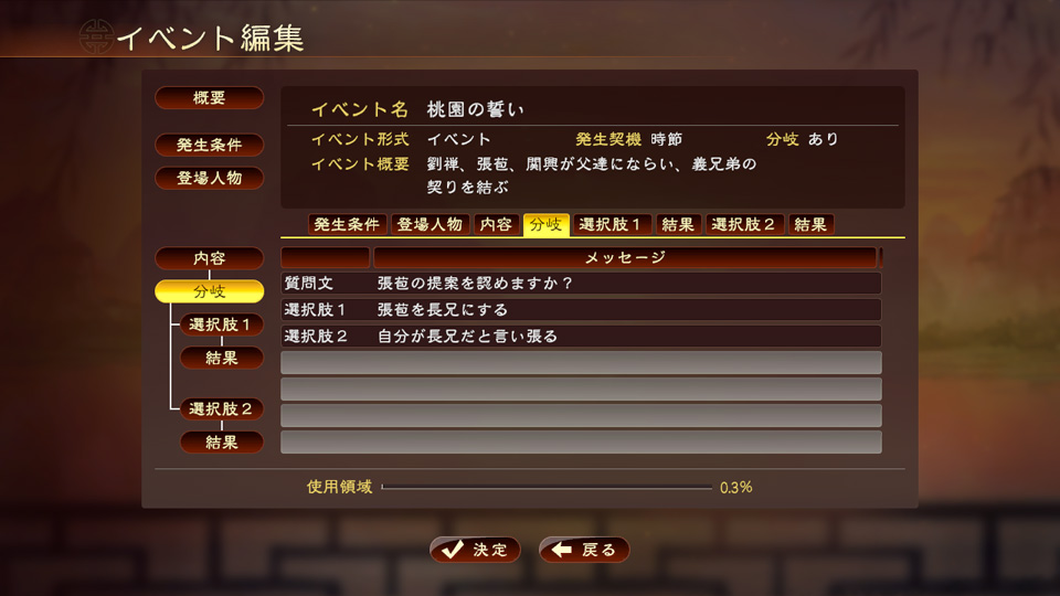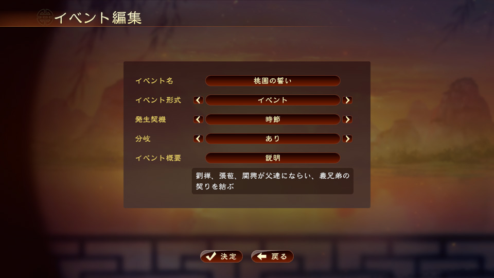 イベント名や発生契機、分岐といった設定部分と、登場人物や会話、演出といった内容部分を編集し、イベントを組み立てていきます。自分で作成した登録武将も使用できるので、自分だけの三国志を自由に創り上げられます。