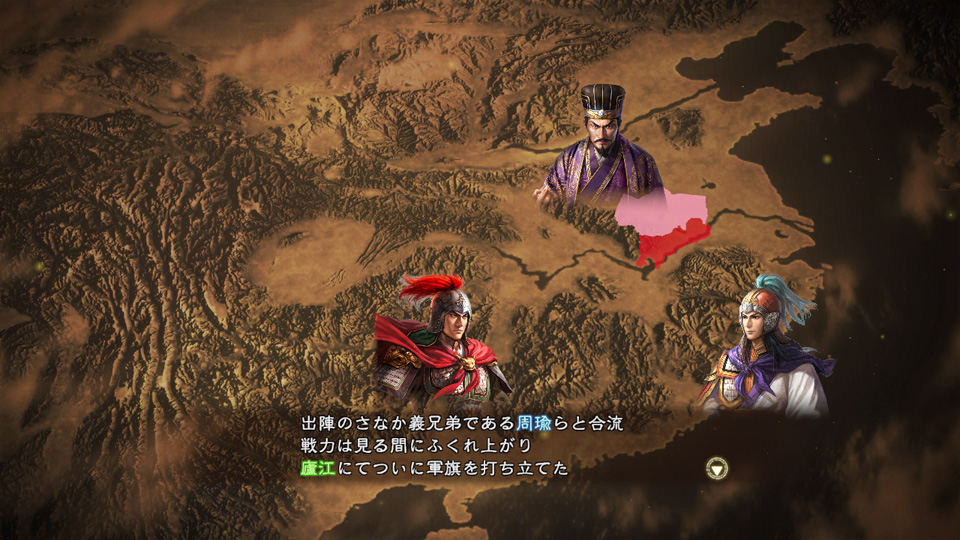 袁術より兵を借り受けた孫策が、義兄弟・周瑜らとともに戦力を拡大していこうとしています。曹操の反攻に遭い兗州を追われた呂布や、陶謙より徐州を譲り受けた劉備など、あまたの英傑が新天地を得て激闘を繰り広げます。