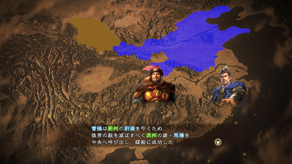 曹操が赤壁の戦いに敗れ、華容道にて討ち死に! 曹操死亡の混乱から勃発した遺児たちによる後継者争いや、劉備、馬騰、孫権らによる旧曹操領の奪取など、平穏を取り戻しつつあった中原が再び戦火に包まれます。