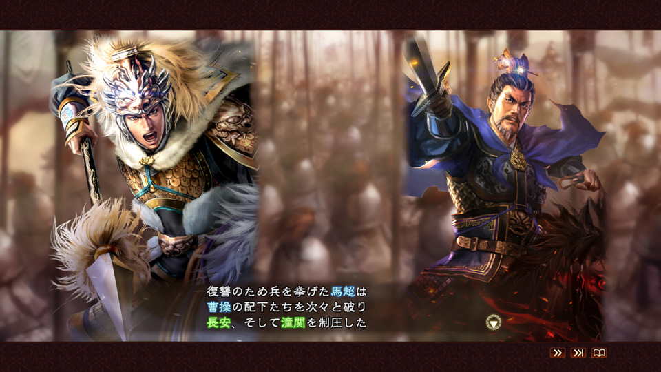曹操による馬騰殺害を受けて激怒した馬超と、馬騰の義兄弟の韓遂らが、曹操に復讐戦を挑みます。馬超らの猛攻で窮地に陥った曹操、周瑜を失い精彩を欠く孫権、新天地・巴蜀へ向かおうとする劉備など、各君主が転機を迎えます。