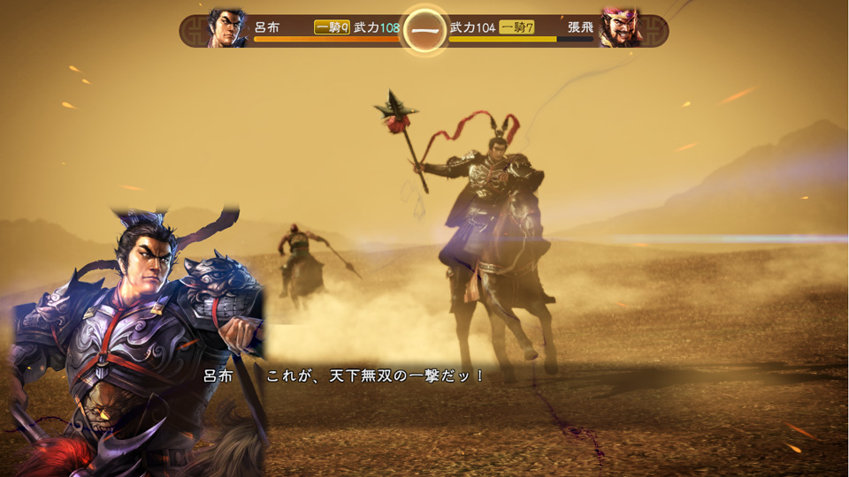 威名万夫不当は一騎討ちでも強力です。専用コマンド[ 挑戦 ]は、隣接する敵部隊を選択して、部隊長に一騎討ちを挑めます。さらに特性の一閃の効果で、一騎討ちの開始時に一撃を加えて、対戦相手の体力を大きく削れます。