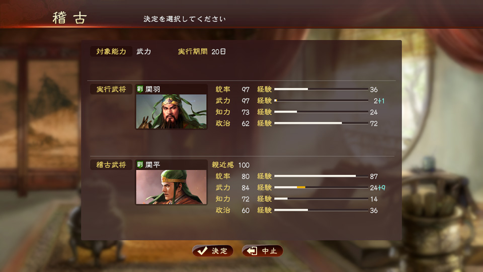 武官は武将の鍛錬や兵糧の確保といった戦闘への備えにも力を発揮します。武官系統全般が使用できる[ 稽古 ]では、相手を指定してお互いの武力を鍛えられます。また威名勇士や剛勇などでは、要衝から兵糧などを調達できるコマンドを使用できます。