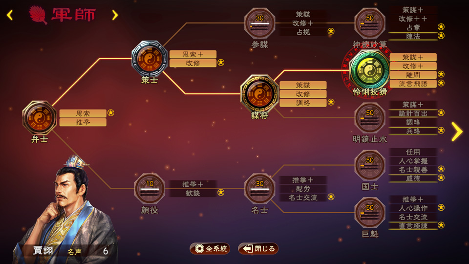 軍師系統は策によって、戦わずして敵勢力を内側から崩します。威名参謀は[ 占拠 ]で敵要衝を戦わずして奪えます。また、威名怜悧狡猾(れいりこうかつ)は[ 流言飛語 ]で複数の敵武将の忠誠を一気に下げられます。戦いの前に敵勢力の要衝や人材を奪って弱体化させれば、有利に事を進められます。