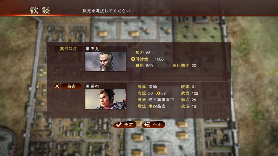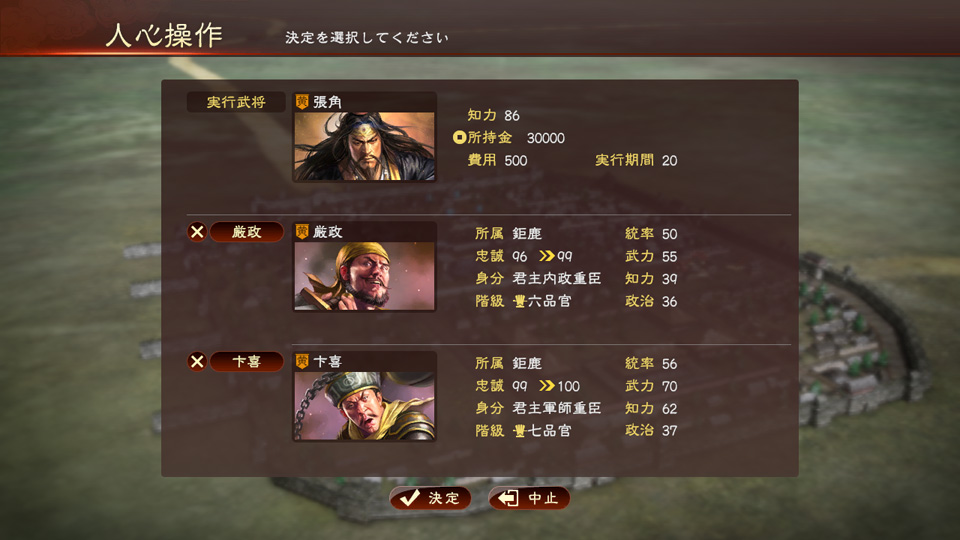 軍師系統は自勢力の人心掌握にも役立ちます。たとえば威名顔役の[ 歓談 ]や威名名士の[ 名士交流 ]を使用すれば、武将の忠誠を上げられます。さらに威名巨魁の[ 人心操作 ]では武将の忠誠を上げられるだけでなく、自分に対して畏敬状態にできます。畏敬状態にすると親近感が上がりやすくなり、ひいては絆も結びやすくなります。