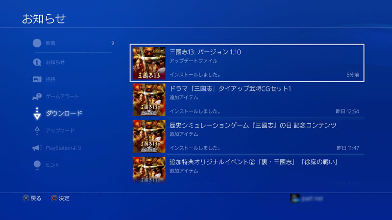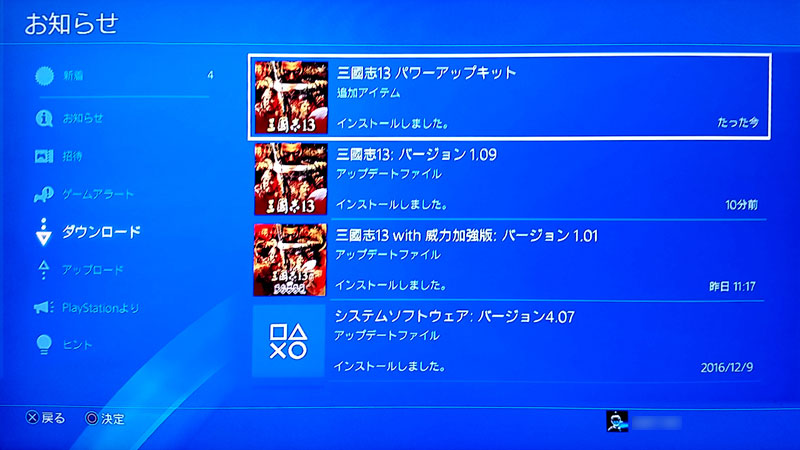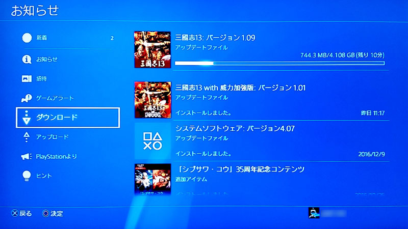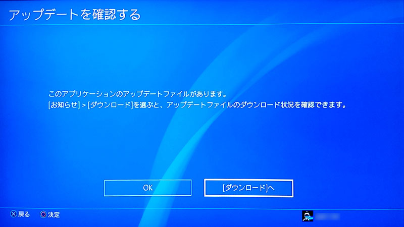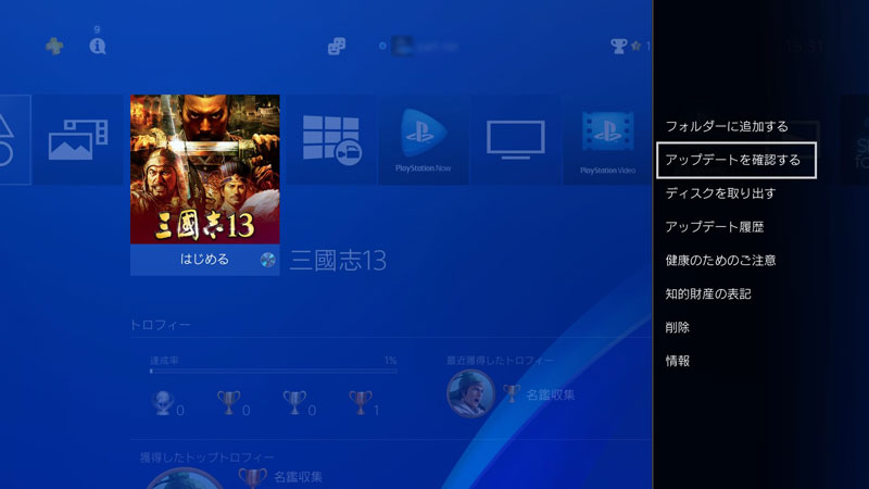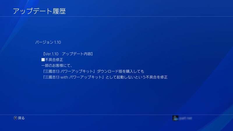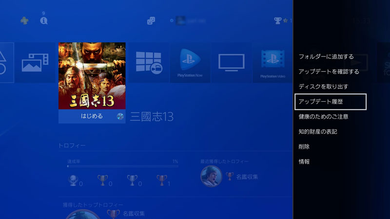 タイトルに合わせて[OPTIONS]ボタンを押してメニューを表示させ、[アップデート履歴]を選択すると……。
