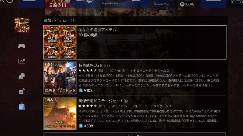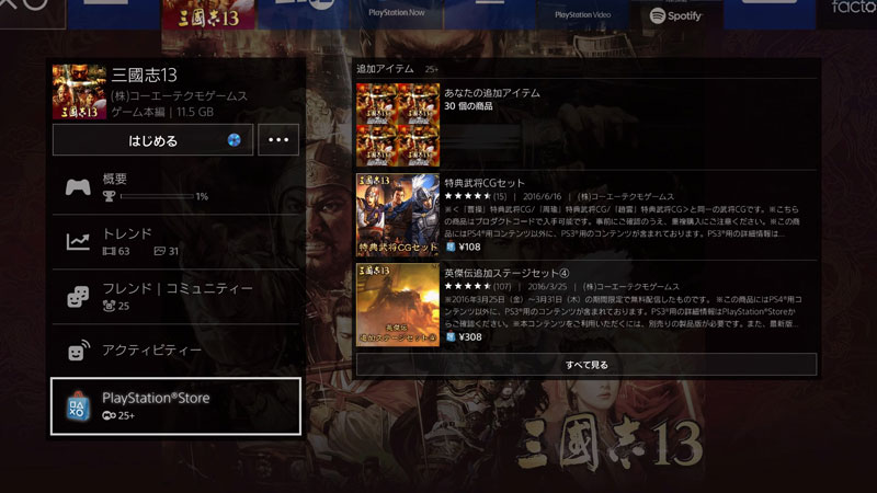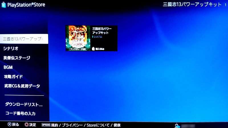 2. 『三國志13』を起動し、メインメニューから[ダウンロードコンテンツ]を選択してPlayStation®Storeにアクセスします。表示された「パワーアップキット」を購入します。