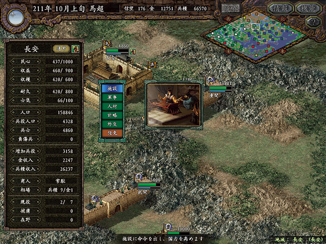 ![]() 中国統一は国単位から都市単位へ。配下の身分を「任命」して効率的に組織運営しながら、46都市の統一を目指します。種類豊富な戦場では、歩兵、騎兵、弩兵などの部隊や兵士の「士気」、時間経過、天候変化までもが戦局に関わり、現実さながらの戦闘が楽しめます。グラフィックの強化に加え、「史実モード」と「仮想モード」の採用も特徴です。 ▶ ニンテンドー3DS用ソフト『三國志2』として8/6発売 |