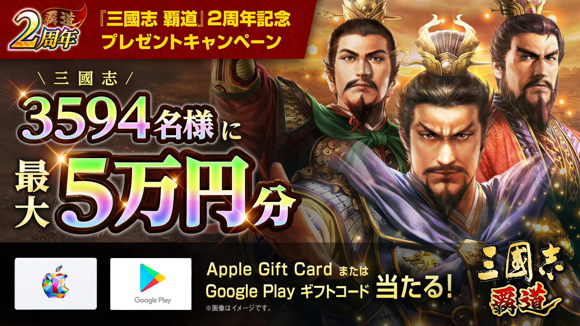 2022年9月15日で『三國志 覇道』サービス開始から2周年になるのを記念し、日頃のご愛顧に感謝を込めて期間中3594(三國志)名様に最大5万円分のApple Gift CardまたはGoogle Play ギフトコードが当たるキャンペーンを開催!
