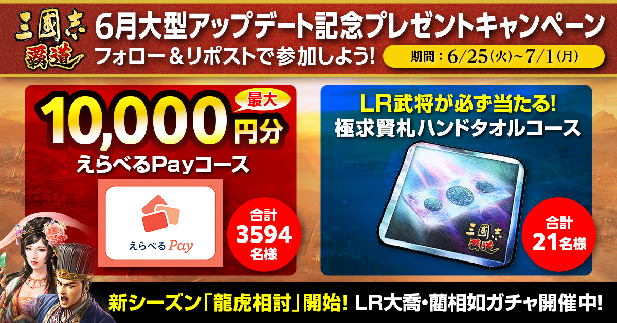 6月の大型アップデートを記念して期間中、3594(三國志)名様に最大1万円分のえらべるPayが当たる“『三國志 覇道』6月大型UD記念プレゼントキャンペーン”を6月25日(火)から 7月1日(月)までの期間限定で開催いたします。