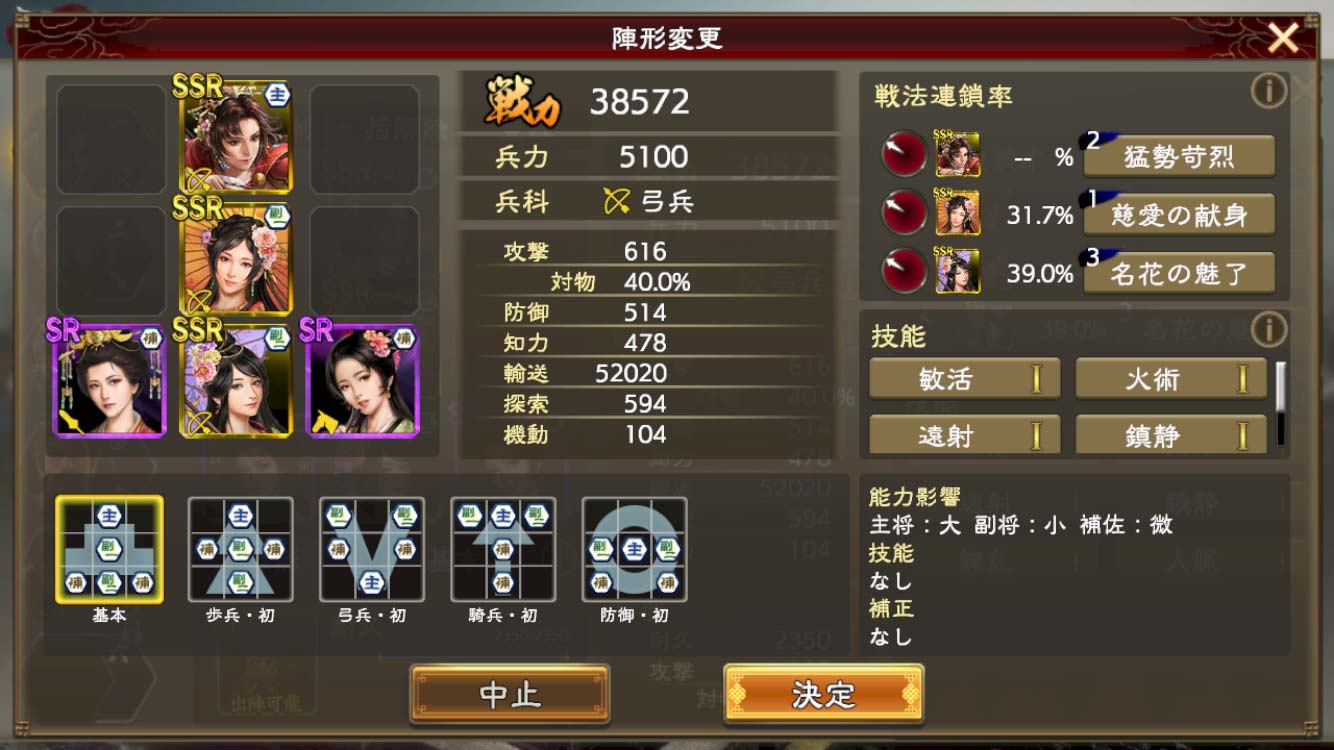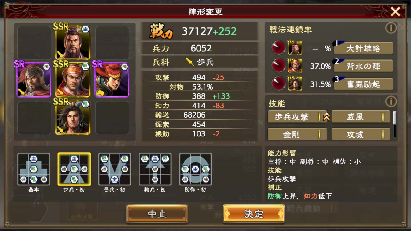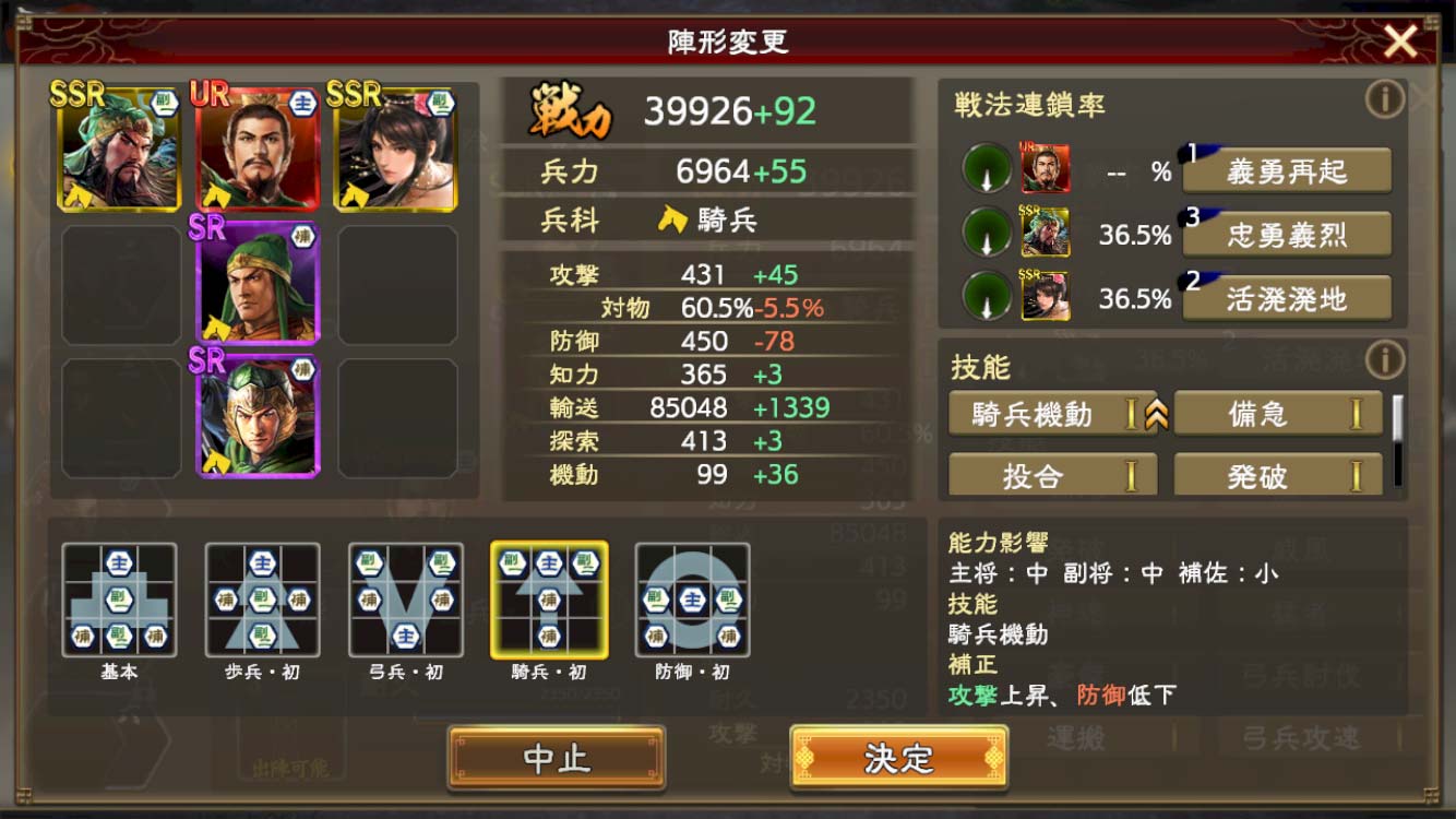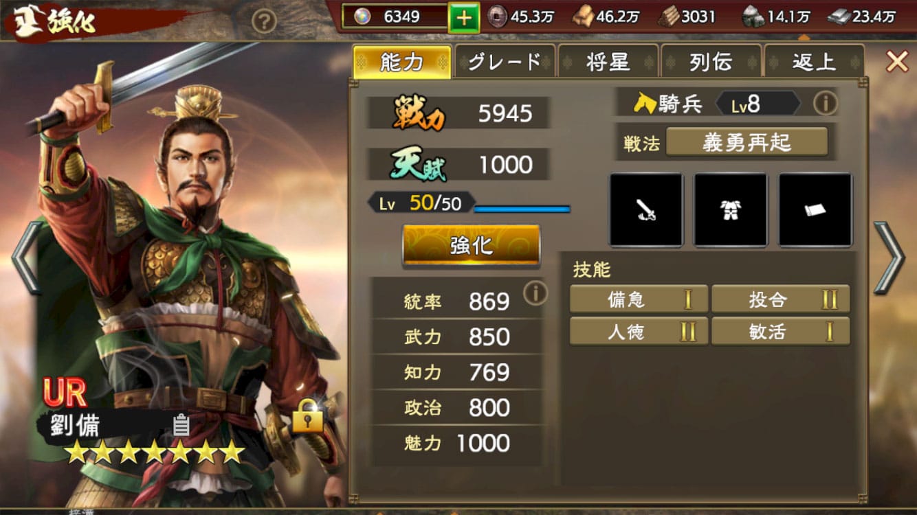 なお、「SSR劉備」と「UR劉備」など同名の武将は、レアリティが違っても同時に使用できない。