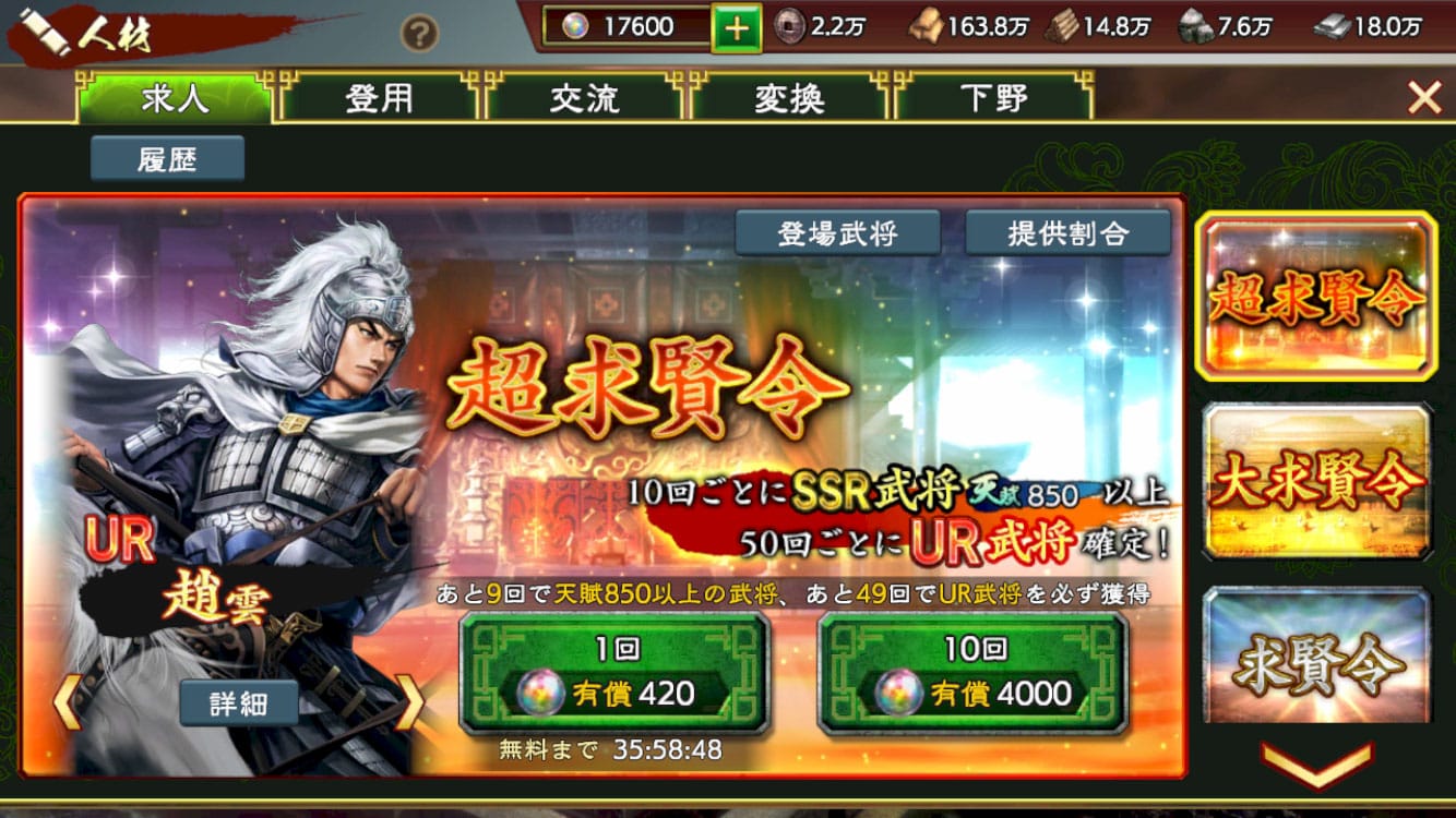 「UR武将」は、新規に追加となる「超求賢令」(ガチャ)が主な入手手段。