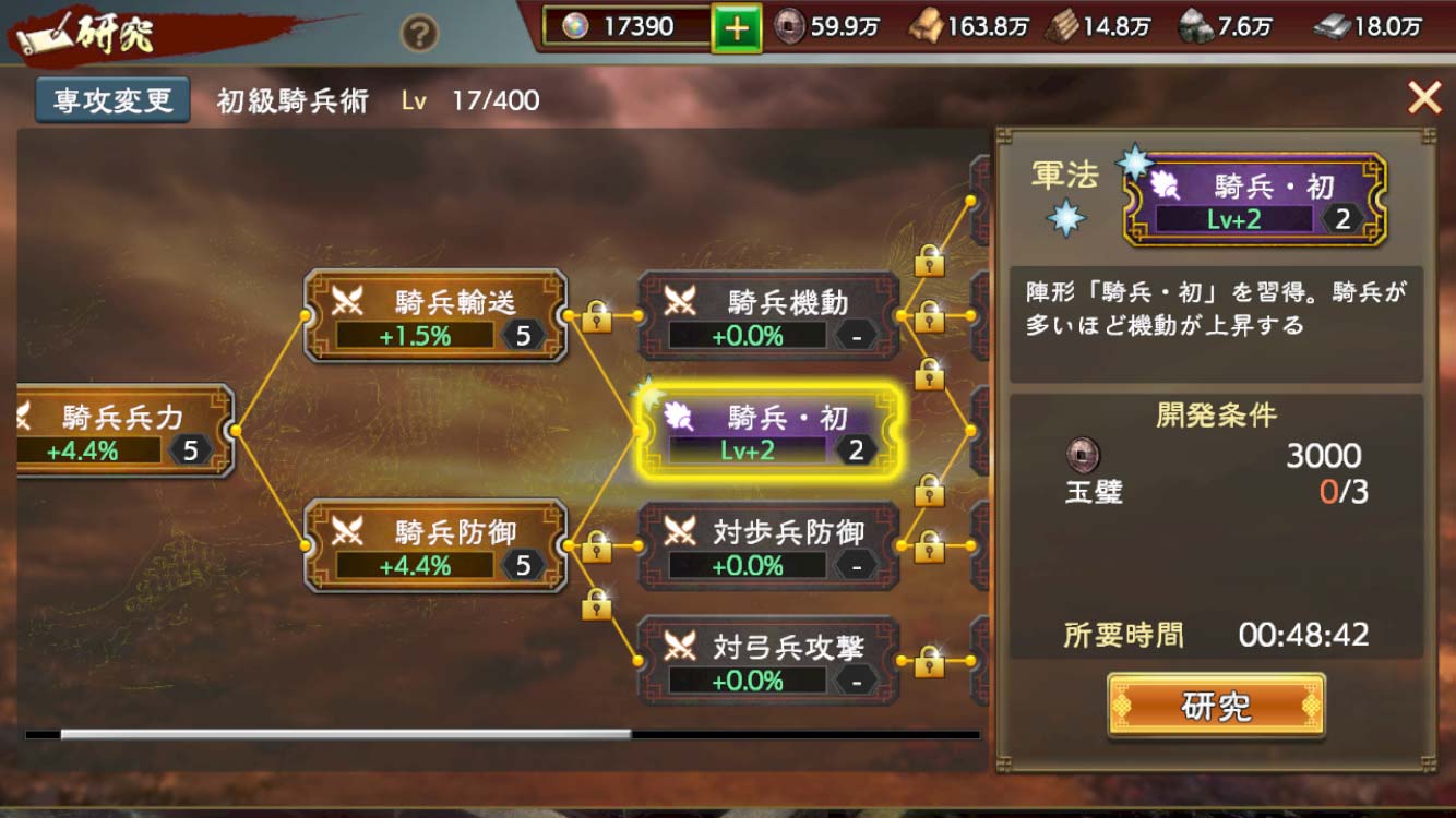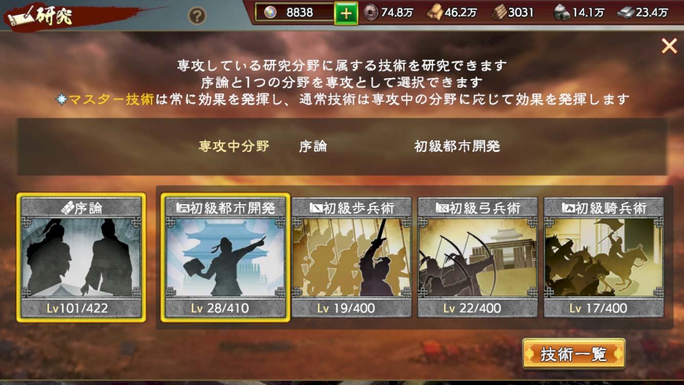 現在の研究技術のツリーを「序論」とし、「初級都市開発」「初級歩兵術」「初級弓兵術」「初級騎兵術」の新たな「研究分野(ツリー)」を追加。