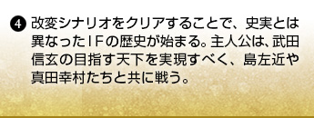 「無双演武」は、メインとなる長編ストーリーモード。従来シリーズ作のような各武将に焦点を当てたものではなく、プレイヤーの分身となる主人公が、戦国時代を通してさまざまな合戦に参戦し、天下統一までの歴史を体感するモードです。 また、正史に沿ったストーリーに加え、歴史ファンならば一度は思い描きたくなる「IF」の世界が繰り広げられます。