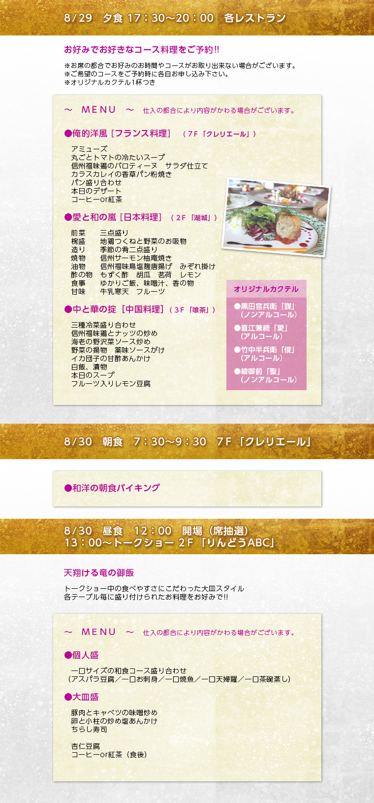 8月30日(土)開催「お泊まりde戦国無双in蓼科〜両兵衛の章〜」では