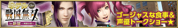 「ホテル de 戦国無双 in新宿 ~明智の章~」前売券販売のお知らせ 「ホテル de 戦国無双 in品川 ~佐和山の章~」の会場で、 「ホテル de 戦国無双 in新宿 ~明智の章~」前売券を限定販売いたします。 ※チケット料金 32,000円(税込) ※前売券はお一人様2枚までとさせていただきます。 |