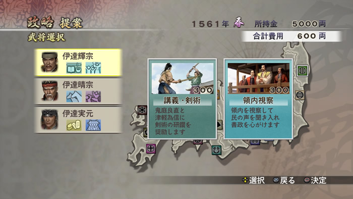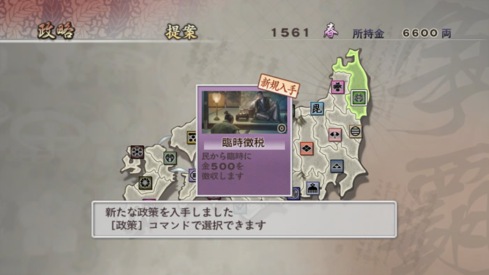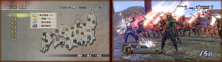 “政策カード”を使った政略によるシミュレーション要素と、合戦のアクションゲームの爽快感を楽しむことができます。