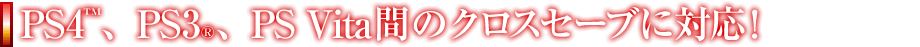 PS4、PS3、PS Vita間のクロスセーブに対応!PlayStation®4版、PlayStation®3版、PlayStation®Vita版の間で、ネットワークを経由したクロスセーブが可能です。