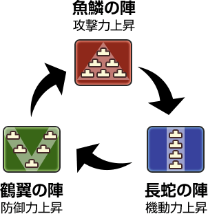 敵軍も陣形を駆使してきますが、陣形の持つ「攻撃」「防御」「機動」の3つの系統はそれぞれ相性を持つため、敵軍の陣形を相性の良い陣形で迎え撃ち、逆転を狙うことができます。