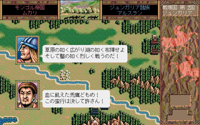シナリオは「モンゴル編」と「世界編」の2編。モンゴル編ではテムジン(若き日のチンギス・ハーン)となって、モンゴル民族の統一をめざします。世界編では、モンゴル帝国国王チンギス・ハーンとなり、ユーラシア大陸の強国と世界制覇をめざして戦います。
