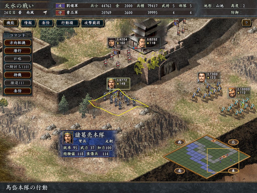 中国統一は国単位から都市単位に。配下の身分を「任命」して効率的に組織運営をしながら、46都市の統一を目指します。種類豊富な戦場では、歩兵、騎兵、弩兵などの部隊や兵士の「士気」、時間経過、天候変化が戦局に関わり、複雑な戦況をともなった戦闘が楽しめます。
