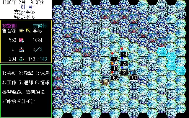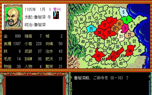 中国最大の伝奇小説「水滸伝」を戦略シミュレーション化。プレイヤーは官吏に追われる無頼漢の一人。各地に散らばる英雄や豪傑、妖術使いの美女たちを仲間に加えながら、宋国腐敗の中心となっている賊臣・高俅(コウキュウ)の討伐を目指します。