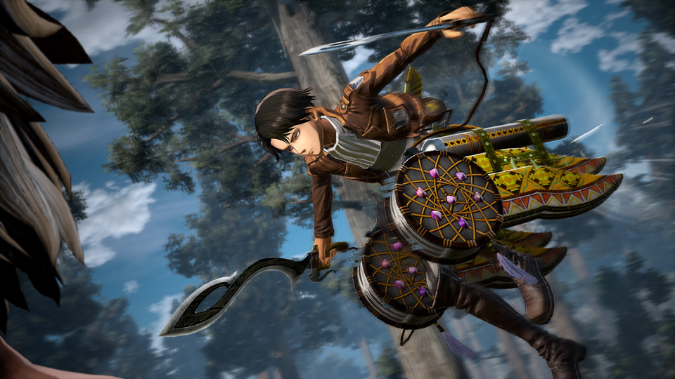 兵士たちの移動、攻撃の両面を支えるのが“立体機動装置”。アンカーを射出して地形や巨人に突き刺し、そこを支点にワイヤーでスイング移動できる装置だ。この動作を繰り返すことで、空中を自由自在に動き回れる。