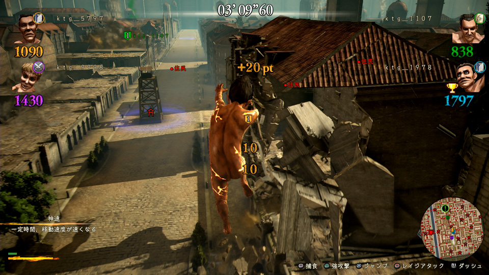 「駆逐モード」では、部位破壊した巨人を討伐したほうが高いポイントを獲得できる。部位破壊後にうなじを攻撃するのが効率のいい方法だが、他のプレイヤーに討伐を横取りされてしまうリスクがある。周囲の動向に気を配り、巨人をどう討伐するか、臨機応変に行動したい。
