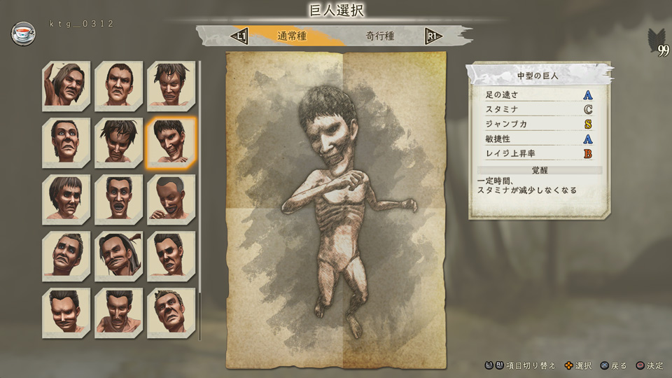 「捕食モード」で操作できるのは、ストーリーモードやアナザーモードで捕獲した巨人たち。見た目だけでなく、能力やスキルも個体によって違うので、さまざまな巨人を捕獲してみよう。
