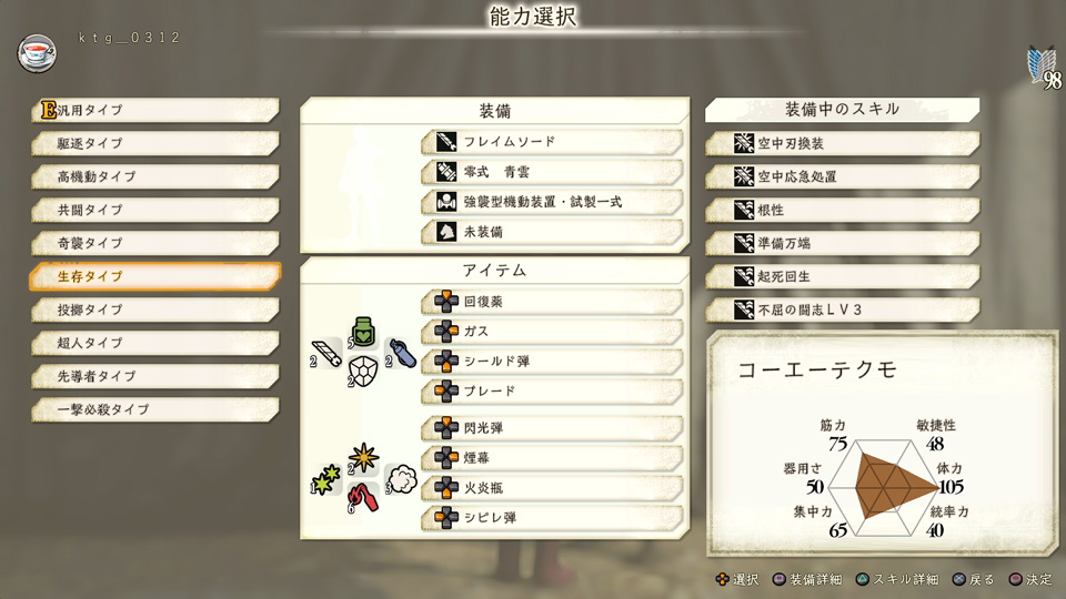 能力やスキル、所持アイテムは10種類のタイプから選択する