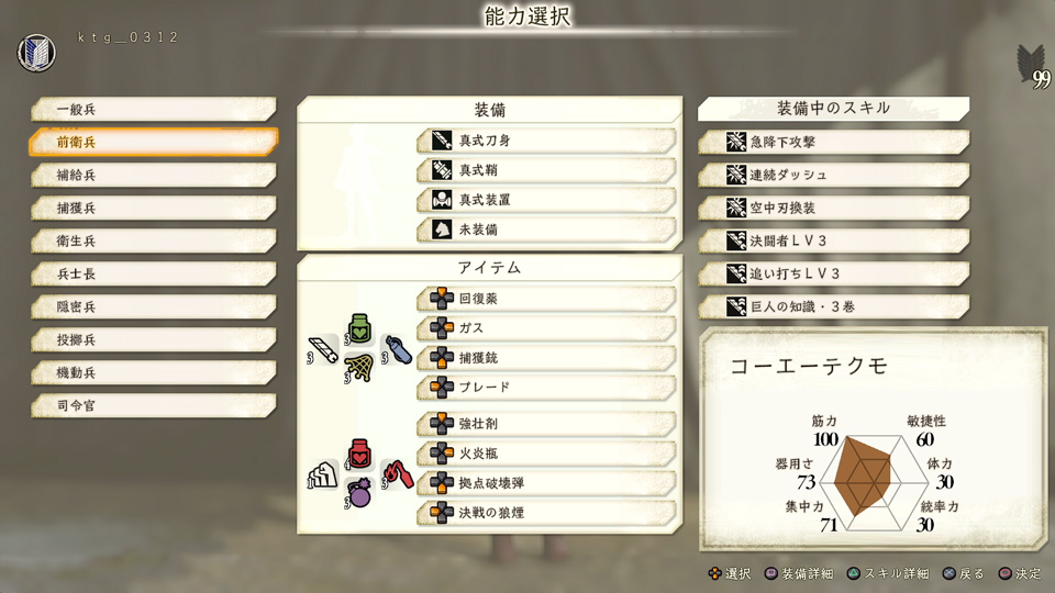 プレイヤーの外見は原作キャラクター、オリジナルキャラクターを含め自由に選択できるが、能力や装備、所有アイテムは、用意された10種類のタイプからひとつを選択する形で、それぞれに設定されたものを駆使して巨人たちに挑むことになる。