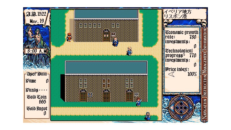 舞台は16世紀初頭のヨーロッパ、大航海時代。プレイヤーは異なる境遇を持つ6人の中から主人公を選択します。遺跡の発見で得られる「冒険名声」や、海戦勝利で得られる「海賊名声」、商品売買で得られる「交易名声」をあげながら、航海士を仲間にして、全世界の海洋と港を舞台に冒険を繰り広げます。
