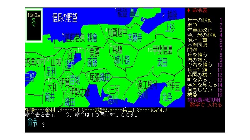 プレイヤーは織田信長または武田信玄となって、天下統一(中部・関西の一部からなる17か国)を目指します。内政で国を富ませて軍備を整え、合戦で他の勢力を倒していきます。