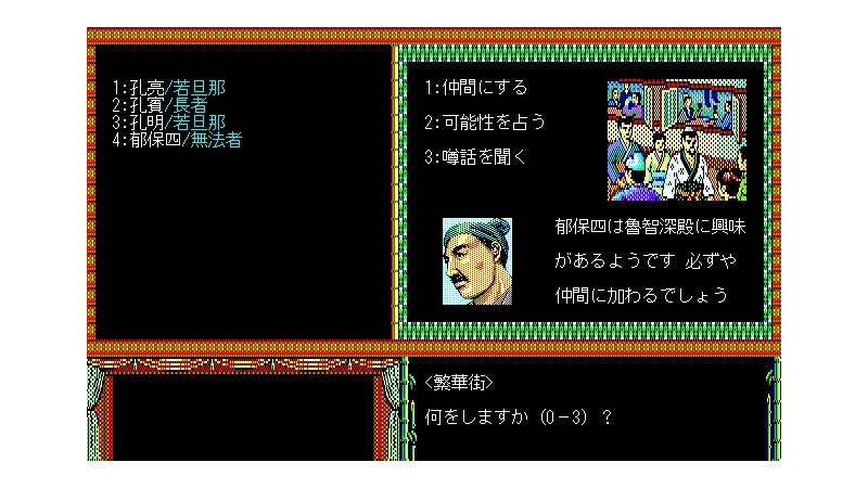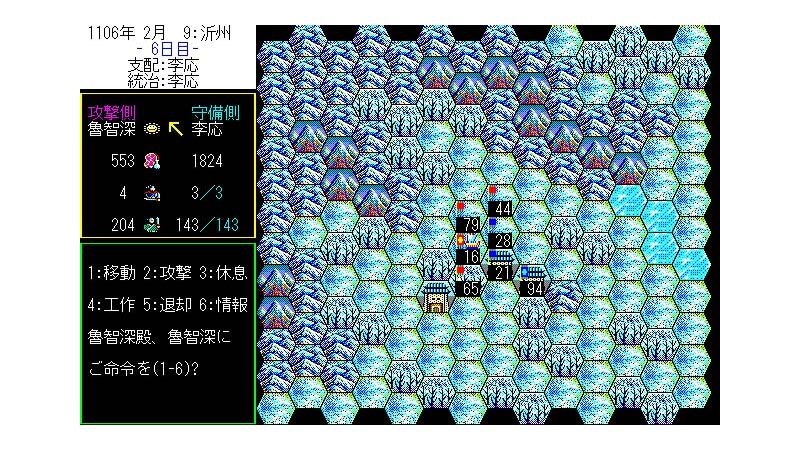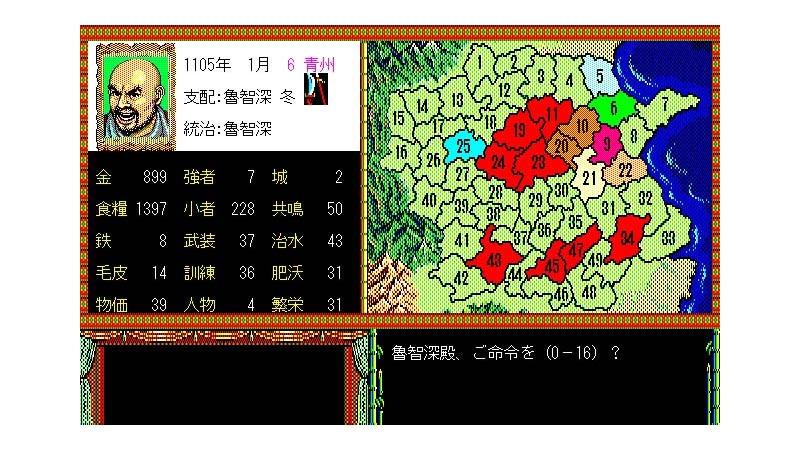 中国最大の伝奇小説「水滸伝」を戦略シミュレーション化。プレイヤーは官吏に追われる無頼漢の一人。各地に散らばる英雄や豪傑、妖術使いの美女たちを仲間に加えながら、宋国腐敗の中心となっている賊臣・高俅(コウキュウ)の討伐を目指します。