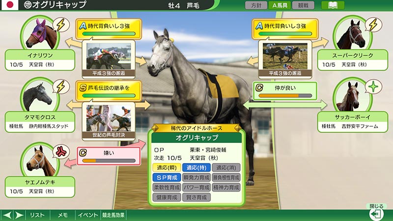 日本競馬史に残るレースを描く「シネマイベント」や、名馬と築き上げた歴史を表現する「名馬相関図」が登場。関係性を多く結び深めることで、愛馬の競走能力アップはもちろん、引退後の繁殖能力向上も。活躍した愛馬を称える「優駿ポスター」も登場し、育成はさらなる高みへ。
