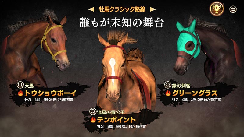 新要素「調教パートナー」での同厩馬(どうきゅうば)の指定やレース出走などをきっかけに、特定のタイミングで「優駿の絆」が芽生えます。その後、絆を結んだ相手と同じレースに出走したり海外遠征に帯同したりすることで「優駿の絆」は徐々に進行。「優駿の絆」が深まるとさまざまなボーナスを獲得でき、攻略の幅がさらに広がります。2. 伝説のTTG対決も再現! 新旧2大シナリオ