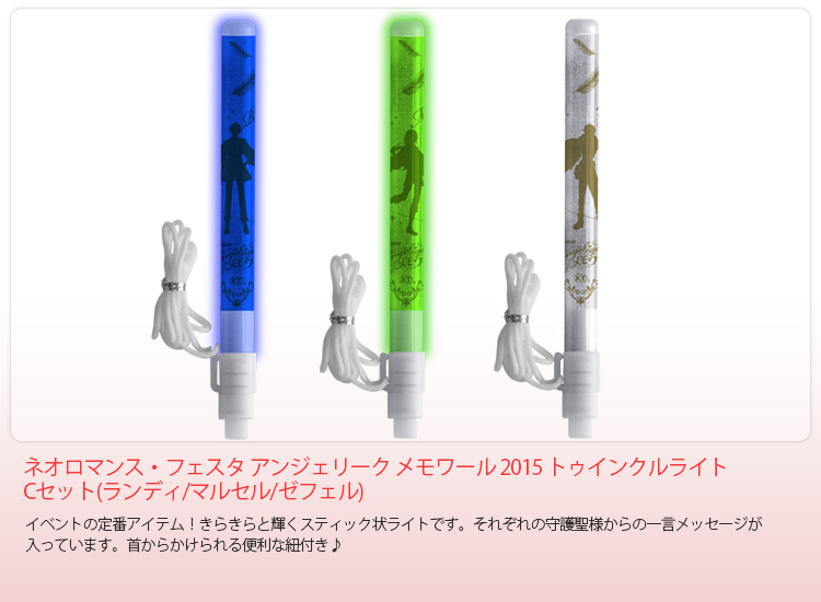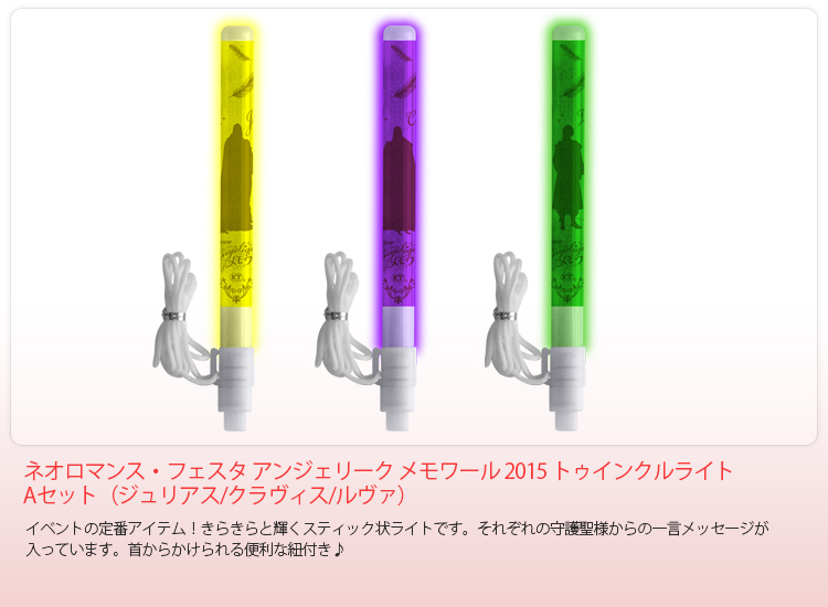 - イベントの定番アイテム!きらきらと輝くスティック状ライトです。それぞれの守護聖様からの一言メッセージが入っています。首からかけられる便利な紐付き!