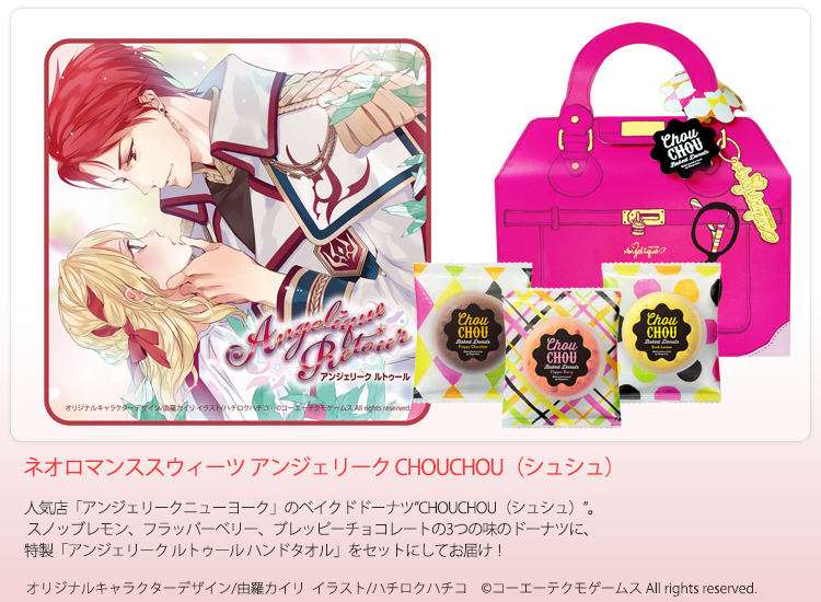 スノッブレモン、フラッパーベリー、プレッピーチョコレートの3つの味のドーナツに、特製「アンジェリーク ルトゥール ハンドタオル」をセットにしてお届け!