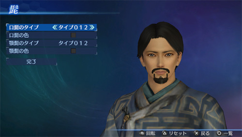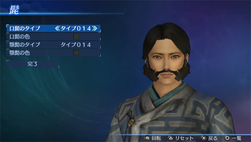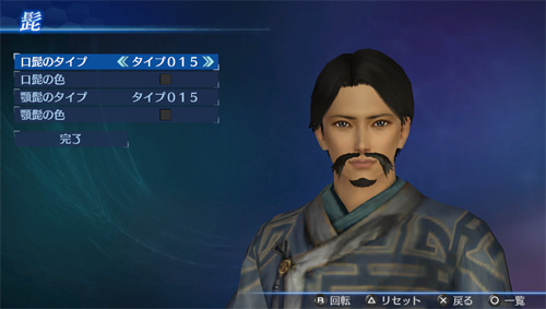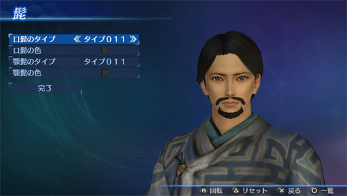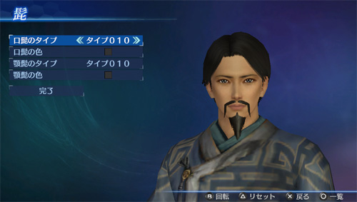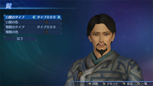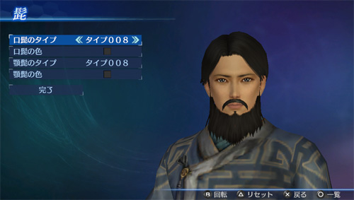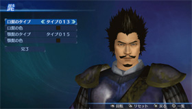 「エディットモード」の武将エディットで、追加の口髭・顎髭タイプが使用可能になります。(口髭8点/顎髭8点)