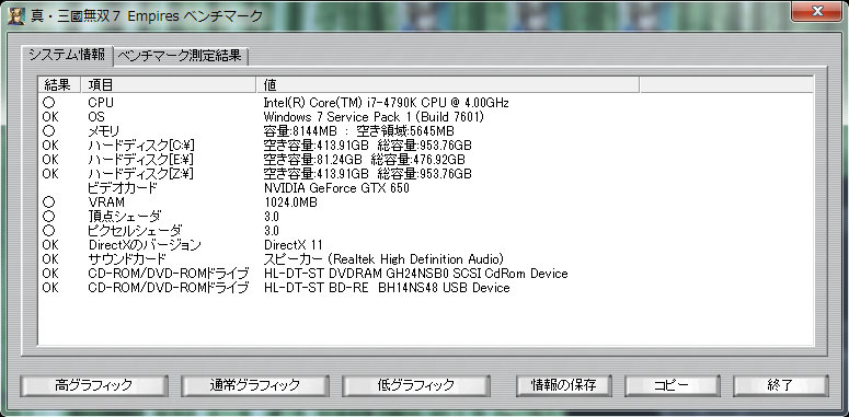 ※ 本プログラムは最低環境の確認であり、Windows版『真・三國無双7 Empires』の動作を保証するものではありません。チェック外の項目、 ご使用のパソコンの環境、常駐ソフトウェアなどの組み合わせなどにより正常に動作しない場合があります。