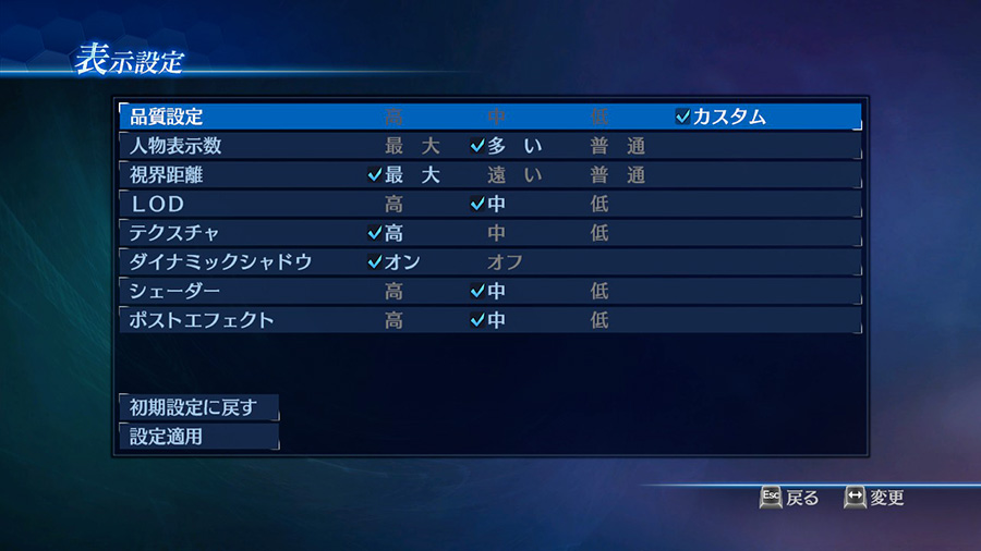 Windows版ならではの特徴として、人物の表示数や視界距離などのグラフィックを詳細に設定ができます。ご使用のPCの性能に合わせて調整すれば、快適に一騎当千の爽快アクションをお楽しみいただけます。また、ハイスペックなPCをご使用の場合は、それぞれの項目を上位の設定にすることで、戦場全体のグラフィックを向上させたり、フレームレートを高めることができます。
