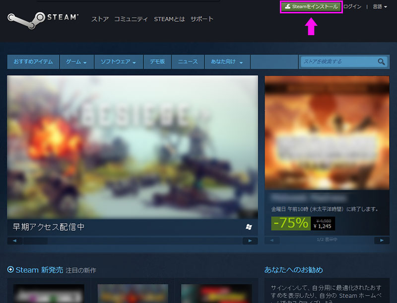 - SteamのWebサイトにアクセスし、画面右上の「Steamをインストール」ボタンをクリックします。画像で確認