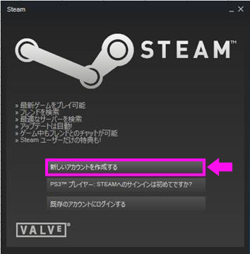 Steamアカウントの新規登録は、Steamのクライアントから行うことができます。以下の手順でSteamアカウントを作成してください。