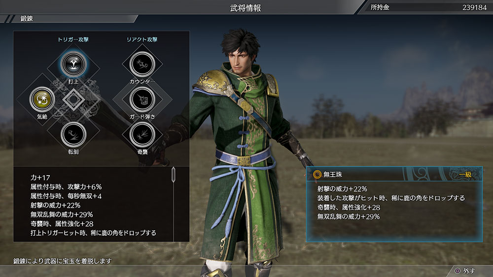 武将を撃破することで手に入ることがあり、各属性攻撃に加え、効果がランダムで4つ付与されます。