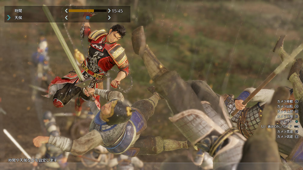 時間と天候、風向き、風の強さといった撮影環境の設定が可能です。時間 5分単位で設定可能 天候 快晴/晴れ/曇り/小雨/雨/大雨/小雪/雪/大雪/霧の10種から選択可能 風の方向 北/北北東/北東/東北東/東/東南東/南東/南南東/南/南南西/南西/西南西/西/西北西/北西/北北西の16方向から選択可能 風の強さ 7段階で設定可能(無風も含む) -