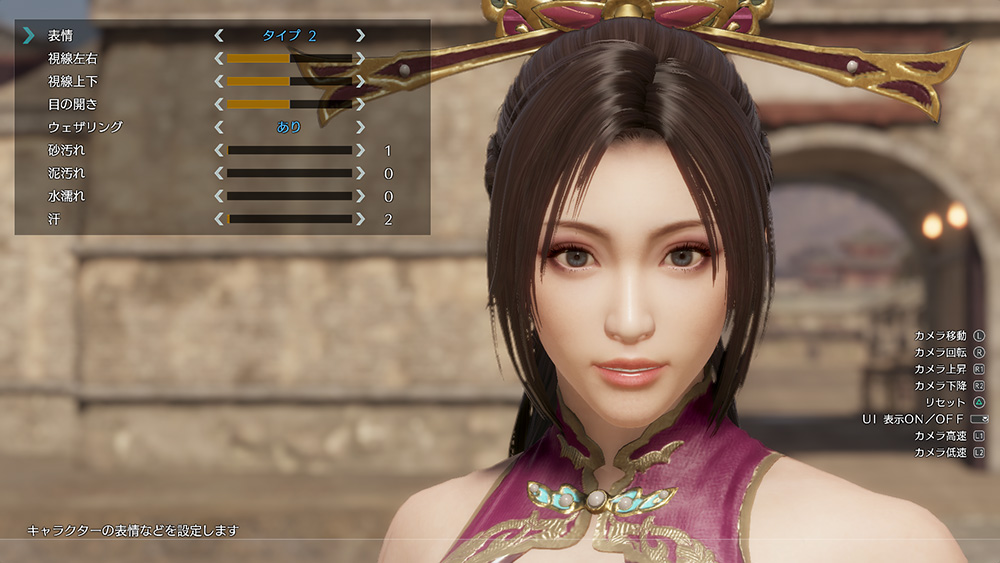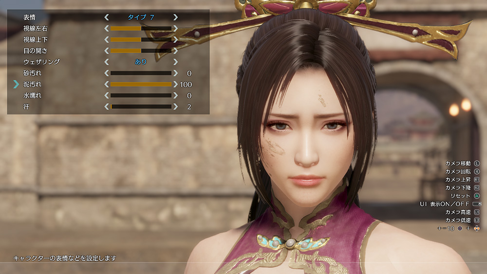 ポーズ中のキャラクターの表情を変えることができます。表情 10種類のタイプから選択可能 視線左右 視線の左右の位置を設定可能 視線上下 視線の上下の位置を設定可能 目の開き 目の開き具合を設定可能 ウェザリング キャラクターの衣装に汚れをつけることができ、「砂汚れ」「泥汚れ」「水濡れ」「汗」をそれぞれ0〜100の範囲で設定可能 -
