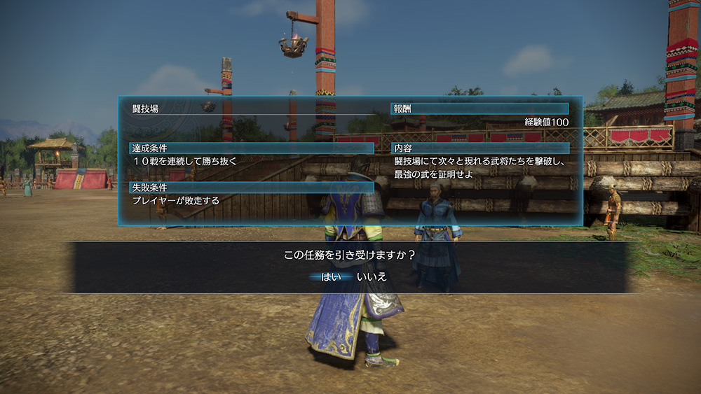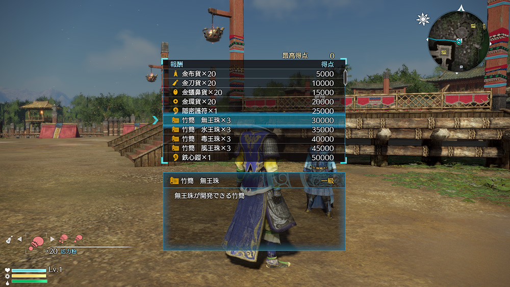 近くの仙人に話しかけることでプレイ可能となり、門の耐久力や敵の撃破数などで決まる得点に応じて報酬が手に入ります。