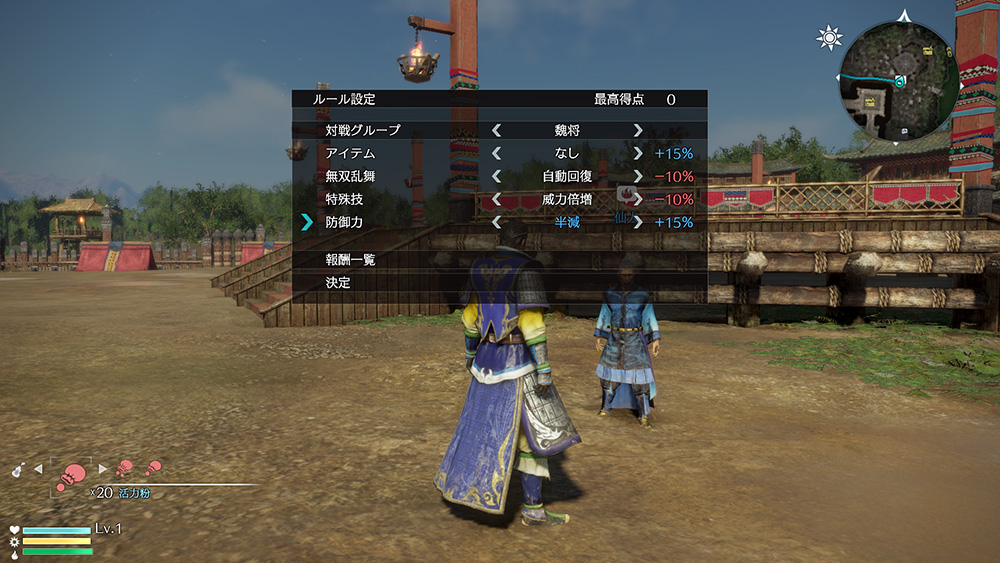 「通常」「禁止」「威力倍増」から選択でき、「禁止」の場合は得点が+15%、「威力倍増」の場合は-10%される。防御力 プレイヤー武将の防御力の設定。
